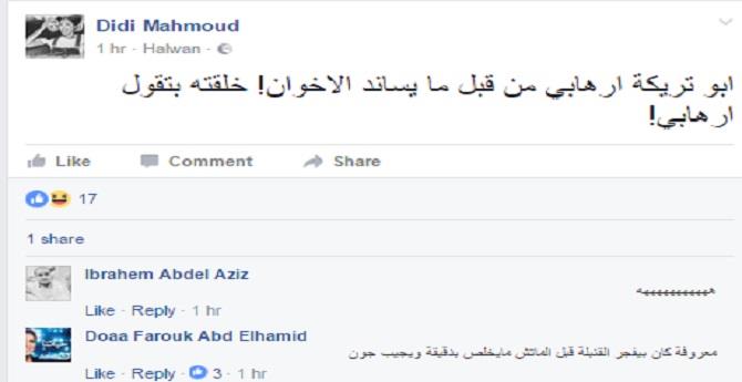 وكتبت داليا البحيري تغريدة قالت فيها : ” ابو تريكة ارهابي من قبل ما يساند الاخوان” ما أثار موجة من الغضب ضدها .