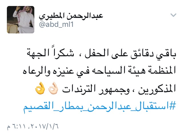 وكان المتسابق عبد الرحمن المطيري أعلن ذلك في تغريدةٍ له، اليوم، عبر حسابه على موقع التواصل الاجتماعي (تويتر)، قائلًا: “باقي دقائق على الحفل، شكرًا الجهة المنظّمة هيئة السياحة في عنيزة، والرعاة المذكورين، وجمهور التريندات”.
