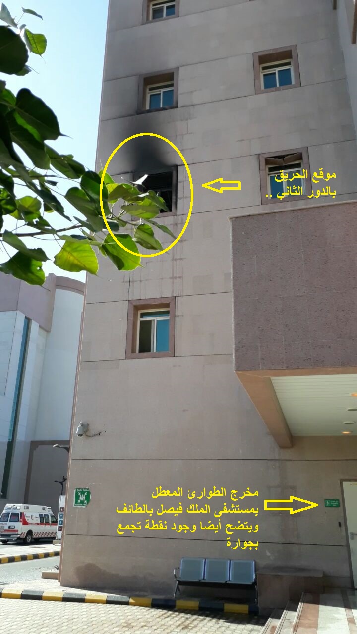 أُغلق أهم مخرج طوارئ بمستشفى الملك فيصل بالطائف، صباح اليوم، أثناء الحريق الذي اندلع بقسم الباطنية التابع للرجال وأدى إلى إخلاء أكثر من 80 حالة من القسم المتضرر والأقسام المجاورة، وكان مخرج الطوارئ مقفولاً تماماً أو معطلاً أمام فرق الإنقاذ والمواطنين الذين يريدون الخروج من المستشفى أثناء الحريق.
