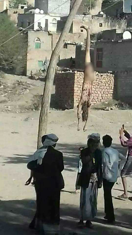 وكشف مصدر عن أن الحوثيّين عمدوا إلى تعليق جثة الرجل وإظهارها على الملأ، في مشهدٍ مهين للذات البشرية، لإدخال الرعب وتوعّد كل من يفكر في الالتحاق بالمقاومة، وقتل كل رغبة في استعادة الشرعية من الميليشيات.