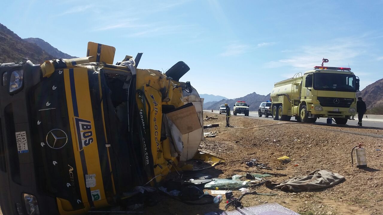 وأوضح العقيد خالد مبارك الجهني، المتحدث الرسمي بمديرية الدفاع المدني بمنطقة المدينة المنورة، أن انقلاب الناقلة وقع عند الساعة ١١:١٥ من صباح هذا اليوم الاثنين بقرية بئر الروحاء على الخط السريع التابعة لمركز المسيجيد بمحافظة بدر، وأدى إلى تسرب حمولتها على جانبي الطريق؛ مما شكل خطراً على المركبات ومرتادي الطريق.