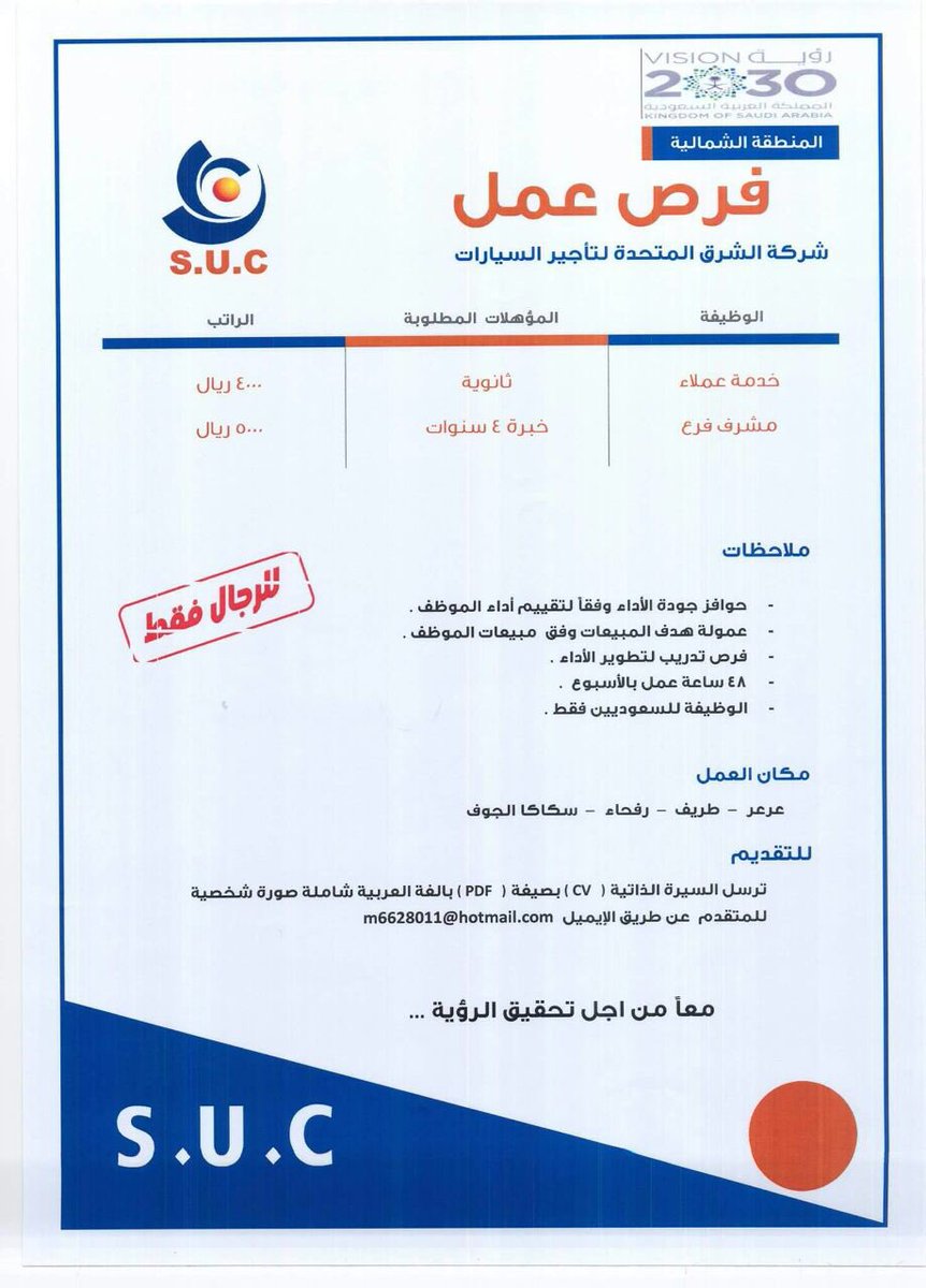 أعلنت شركة الشرق المتحدة لتأجير السيارات عن توفّر وظائف شاغرة للرجال للعمل بفروع الشركة في كلٍ من عرعر، وطريف، ورفحاء، وسكاكا، والجوف، وذلك وفق الوظائف والشروط التالية: