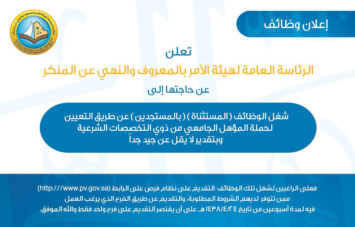 أعلنت الرئاسة العامة لهيئة الأمر بالمعروف والنهي عن المنكر عن حاجتها إلى شغل الوظائف “المستثناة” بالمستجدين عن طريق التعيين، لحملة المؤهل الجامعي من ذوي التخصصات الشرعية وبتقدير لا يقل عن جيد جداً.