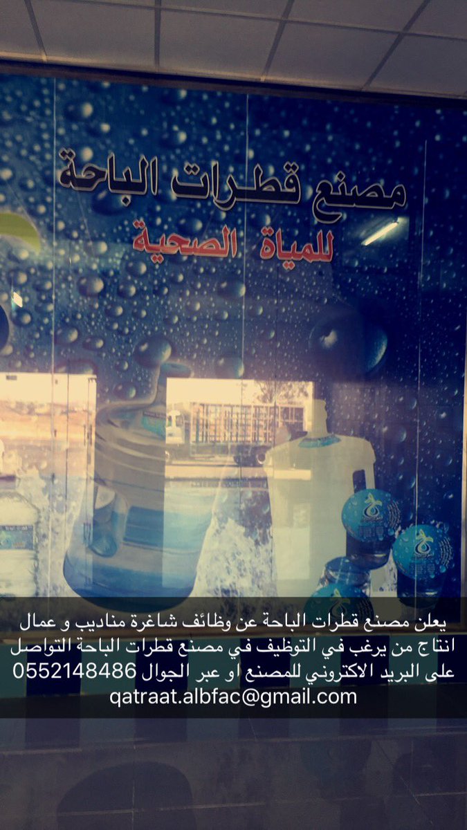 أعلن مصنع قطرات الباحة لمياه الشرب الصحية عن توافر وظائف شاغرة للرجال، للعمل لدى المصنع في منطقة الباحة، وفق الوظائف والشروط التالية: