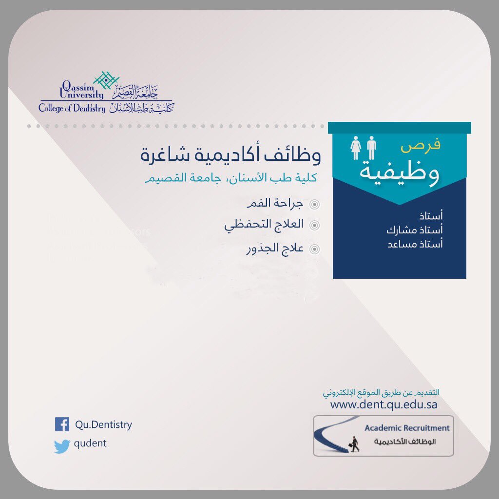 أعلنت كلية طب الأسنان بجامعة القصيم عبر موقعها الإلكتروني (هنا)، عن توافر وظائف أكاديمية شاغرة للجنسين “أستاذ، وأستا مشارك، وأستاذ مساعد”، في تخصصات “جراحة الفم، والعلاج التحفظي، وعلاج الجذور”.