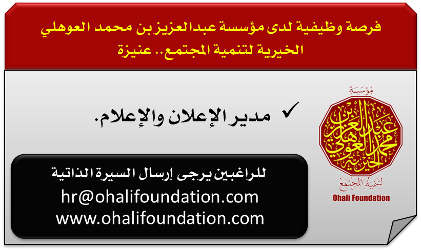 أعلنت مؤسسة عبدالعزيز بن محمد العوهلي الخيرية لتنمية المجتمع بعنيزة – عبر موقعها الإلكتروني (هنا) ، عن توافر وظائف شاغرة للجنسين، وفق مسميات الوظائف التالية:
