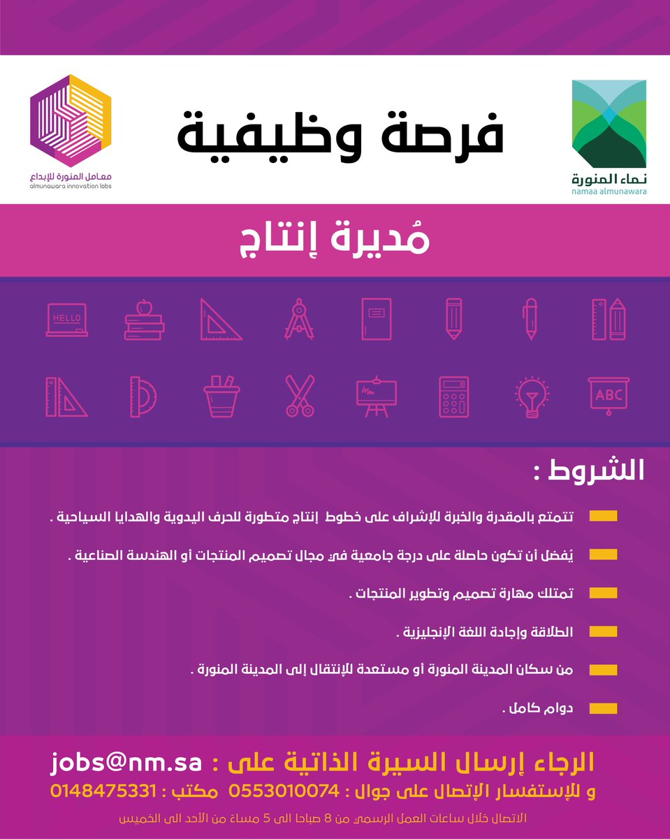 أعلنت مؤسسة نماء المنورة عن توفر وظيفة إدارية شاغرة للنساء، بمسمى “مديرة إنتاج”، للعمل في معامل المنورة للإبداع بمنطقة المدينة المنورة، وفق الشروط التالية: