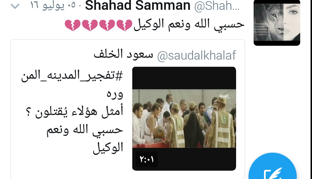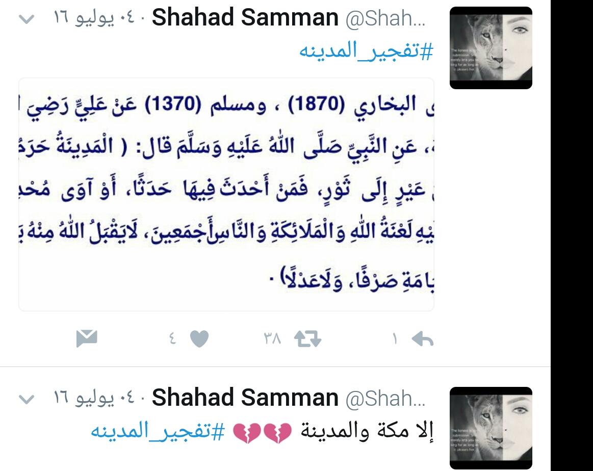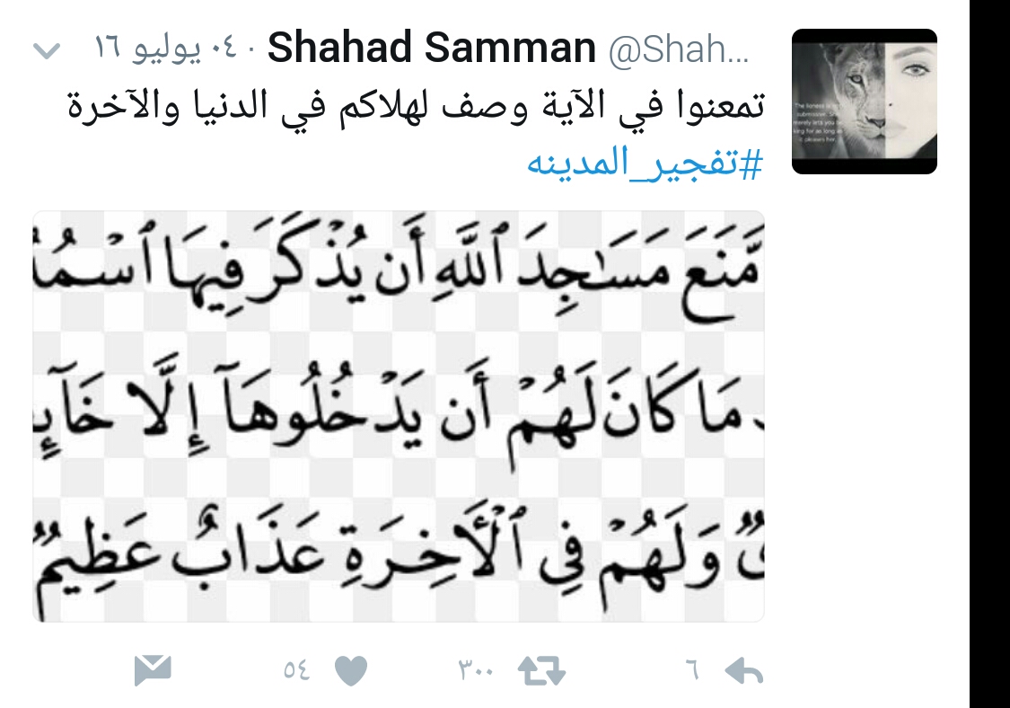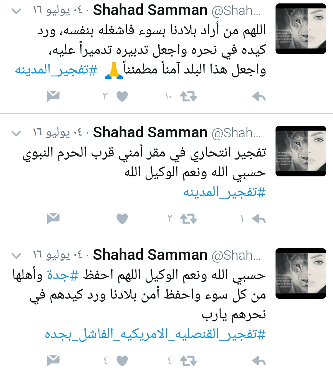 حساب شهد في موقع التواصل الاجتماعي تويتر حمل عبارات تنبذ التطرف والإرهاب في عدد من المواقع، التي طالتها أيادي الغدر، وهي محافظة جدة والمدنية المنورة وتفجير نيس بجمهورية فرنسا.
