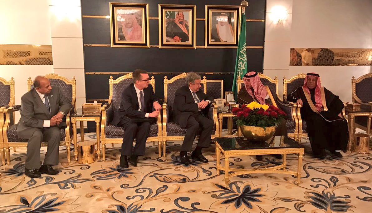 وكان الجبير في استقبال أنطونيو جوتيريس، ومعه المندوب الدائم، ووكيل الوزارة لشؤون المراسم.