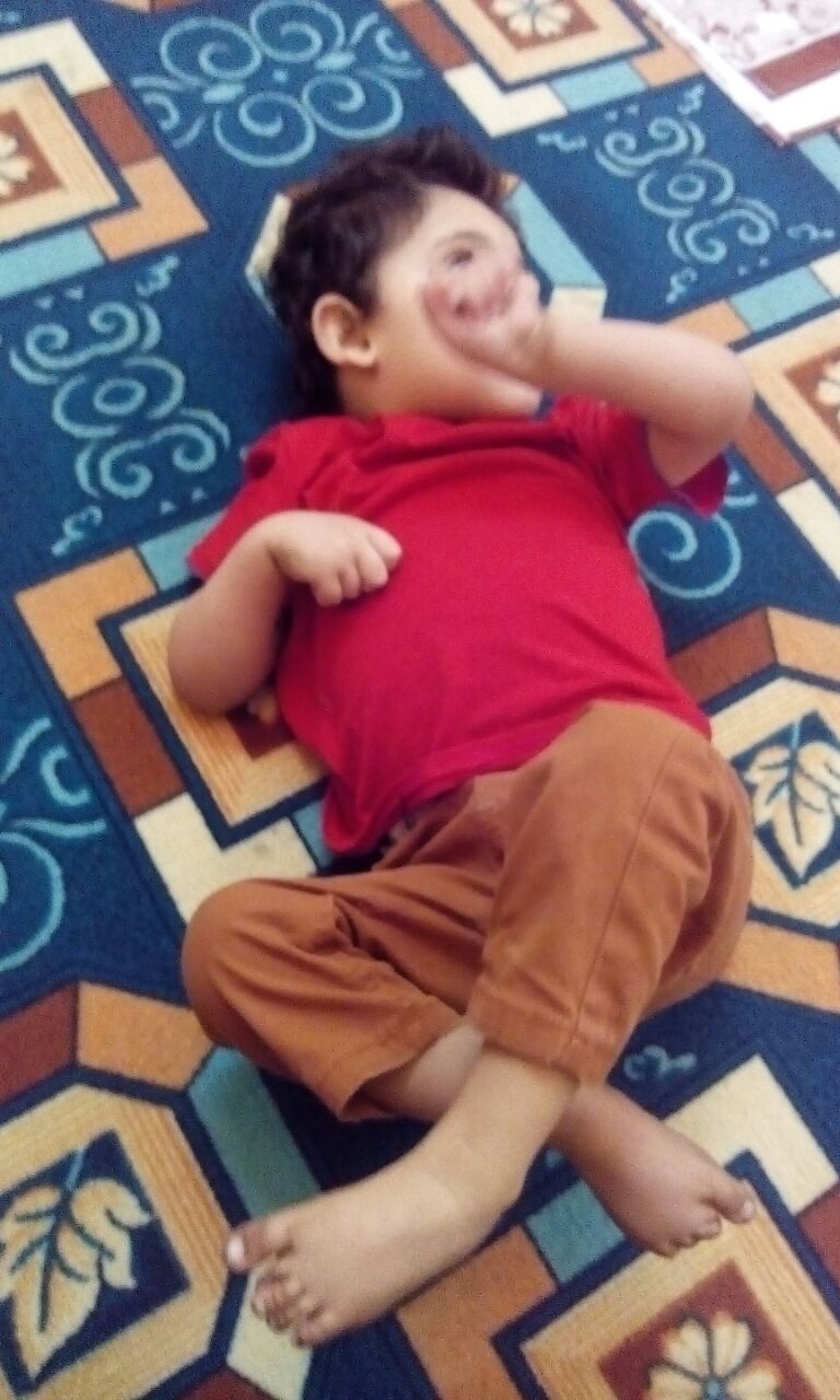 مشاعر الحسرة والألم سيطرت على والد طفل لم يتجاوز الـ 3 سنوات، حيث يرى ابنه كل يوم وحالته في تدهورٍ شديد، ولا يستطيع أن يقدم له أي شيء سوى الدعاء له ليل نهار، حيث فقد بصره بعد ولادته بـ 6 أشهر، وأصابه شلل في الدماغ، وأصبح غير قادر على الحركة.