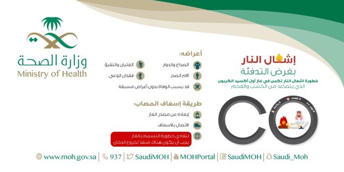 ونشرت الصفحة الرسمية لوزارة الصحة، على موقع التواصل الاجتماعي “تويتر”، إنفوجرافيك يوضح أخطار إشعال النار للتدفئة، حيث يتعرّض الإنسان لغاز أول أكسيد الكربون، ممّا يسبب حالة من الغثيان، والقيء، وفقدان الوعي، موضحةً أنه يمكن أيضًا أن يسبب وفاة سريعة بدون أعراض مسبقة للإنسان.