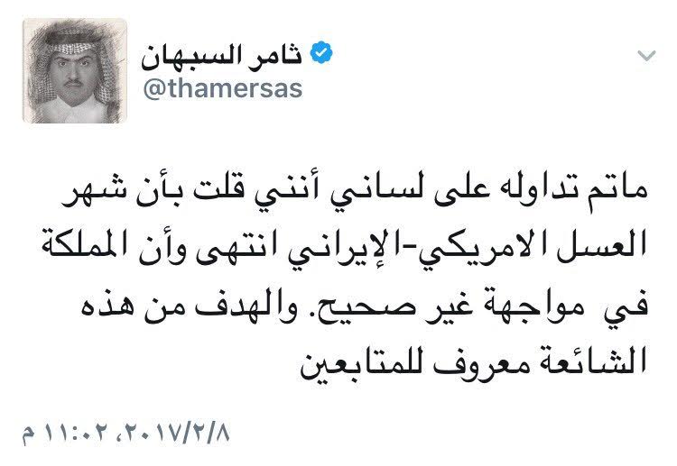 وأكّد السبهان عبر حسابه الرسمي على موقع “تويتر” للتواصل الاجتماعي: “ما تم تداوله على لساني إنني قلت بأن شهر العسل الأمريكي – الإيراني انتهى، وأن المملكة في مواجهةٍ غير صحيحة”.