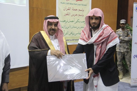 وقد بدأ الحفل بتلاوة آيات من الذكر الحكيم تلاها أحد المشاركين بالمسابقة ثم ألقى مدير إدارة التوجيه الفكري والمعنوي العميد / إبراهيم بن ماطر العنزي كلمة أوضح فيها مدى اهتمام ودعم المدير العام للمسابقة السنوية لحفظ القرآن الكريم لمنسوبي حرس الحدود لما لها من آثار إيجابية على منسوبي حرس الحدود ، بعد ذلك بدأ العرض المرئي الذي يقدم شرحاً عن المسابقة تلا ذلك كلمة الجهات المتعاونة في توعية منسوبي حرس الحدود ألقاها الشيخ الدكتور /يوسف بن عبدالله الباحوث عضو هيئة التدريس بجامعة أم القرى ,تلا ذلك إعلان نتائج المسابقة التي بلغ عدد المشاركين فيها (٧١) متسابقاً حيث تشرف الفائزون باستلام الجائزة من المدير العام .