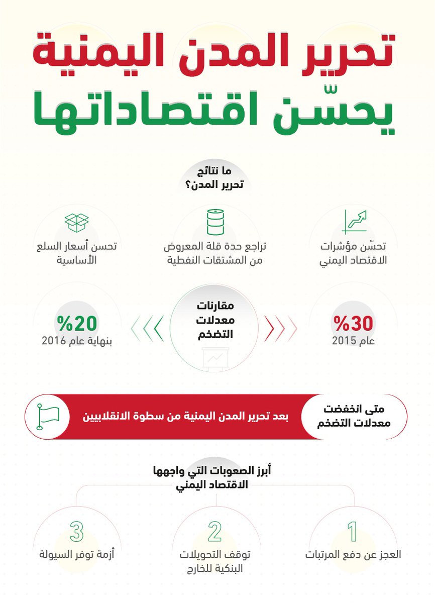 ويعزّز تحرير المدن اليمنية من كفاءة الاقتصاد اليمني، حيث يسهم في تراجع حدة قلة المعروض من المشتقات النفطية، ويحسن أسعار السلع الأساسية.