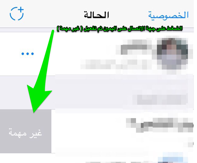 ثانيًا: عند رغبتك بإخفاء منشورات بعض جهات الاتصال عن الصفحة الرئيسية، قم بالدخول إلى واتساب ستوري، ثم اضغط على جهة الاتصال التي تريد إخفاءها، ثم حرّك الاسم على اليمين، وسيظهر لك خيار غير مهمة، قم بالضغط عليه.