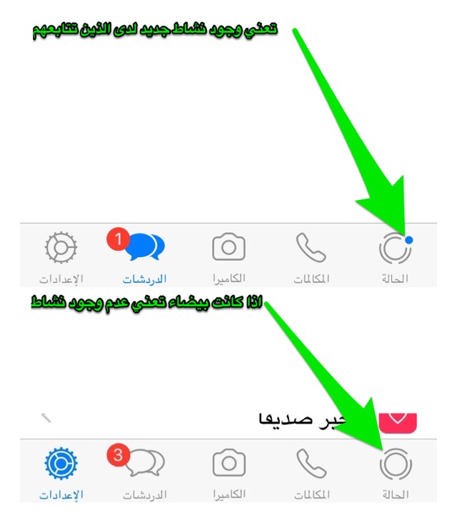 ثالثًا: لمعرفة إن كان هناك نشاط على الصفحة الرئيسية، ستشاهد وجود علامة زرقاء في أيقونة واتساب ستوري عند وجود منشورات جديدة، وعندما تختفي تلك العلامة، فهذا يعني أنه لا يوجد منشورات لم تشاهدها.
