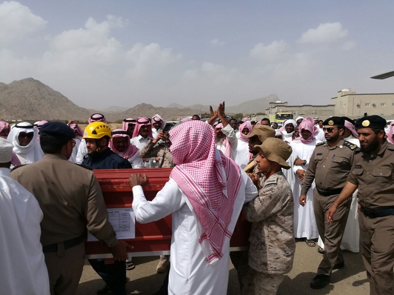 ووصل جثمان الشهيد إلى محافظة العرضيات، ظهر اليوم، وكان في استقباله محافظ العرضيات علي بن يوسف الشريف، وشيخ قبيلة العوامر محمد بن علي شاكر، ورؤساء الدوائر الحكومية وأقارب الشهيد وجمع من المواطنين، فيما استقبله أهله بالتصفيق الحار لابنهم، معبرين عن فرحتهم بأنه استشهد في الحد الجنوبي.
