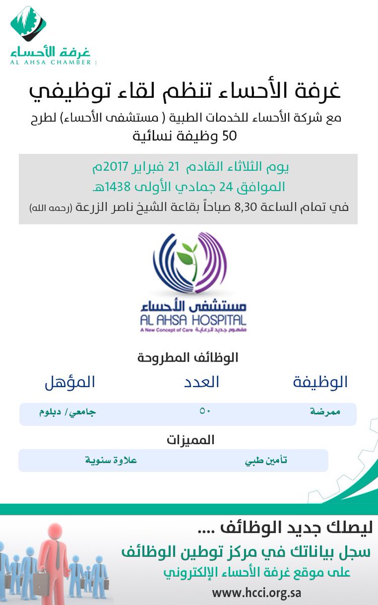 أعلنت الغرفة التجارية الصناعية بمحافظة الأحساء عن طرح (50) وظيفة نسائية بمسمى “ممرضة” لحملة مؤهلات الشهادة الجامعية والدبلوم، وذلك في لقاءٍ توظيفي -بالتعاون مع شركة الأحساء للخدمات الطبية (مستشفى الأحساء)- الذي سوف يعقد يوم الثلاثاء المقبل، 24 جمادى الأولى، الموافق 21 فبراير، في تمام الساعة (8:30) صباحًا، بقاعة الشيخ ناصر الزرعة، بمقر الغرفة.
