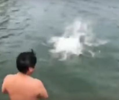 وثق مقطع فيديو يرصد لحظة قيام أب صيني برمي ابنه في بحيرة مياه معتقدا بذلك أنه يعلمه السباحة.