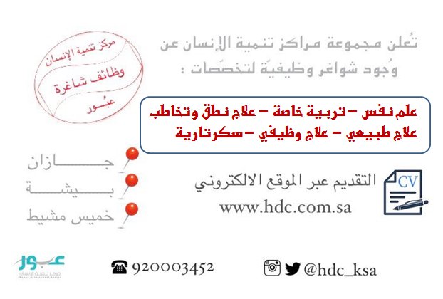 أعلنت مجموعة مراكز تنمية الإنسان “عبور” لتطوير خدمات التشخيص والتقييم والتأهيل -عبر موقعها الإلكتروني- عن توفّر وظائف شاغرة للجنسين في التخصصات التالية: “علم نفس، وتربية خاصة، وعلاج نطق وتخاطب، وعلاج طبيعي، وعلاج وظيفي، وسكرتارية”، وذلك للعمل بفرع مراكز تنمية الإنسان في كلٍ من جازان، وخميس مشيط، وبيشة.