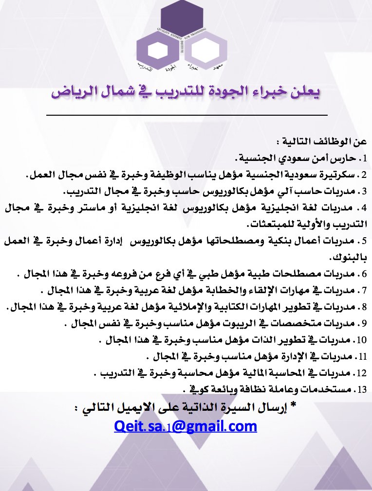 أعلن معهد خبراء الجودة النسائي للتدريب، بمدينة الرياض، عن توفر وظائف شاغرة للجنسين، وذلك وفق الوظائف والشروط التالية: