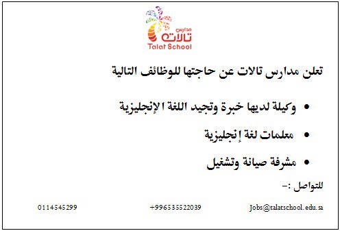أعلنت إدارة مدارس تالات الأهلية بالرياض عن حاجتها للوظائف التالية:
