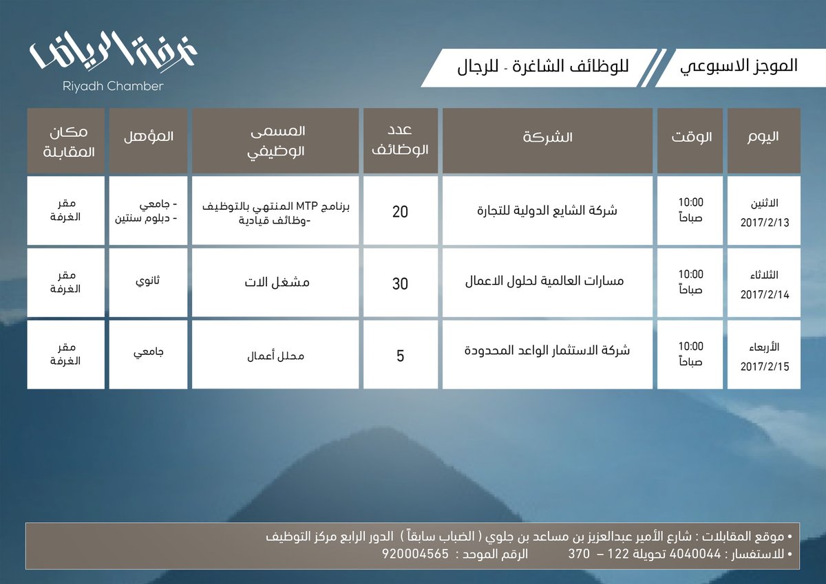 أعلنت الغرفة التجارية الصناعية بالرياض عن توفّر 55 وظيفة شاغرة للرجال لدى 3 شركات بالقطاع الخاص، وهي: “الشايع الدولية للتجارة، ومسارات العالمية لحلول الأعمال، والاستثمار الواعد المحدودة”، لحملة الشهادات الجامعية والدبلوم والثانوية، باسم “برنامج (MTO) المنتهي بالتوظيف، ووظائف قيادية، ومشغل الآت، ومحلل أعمال”.