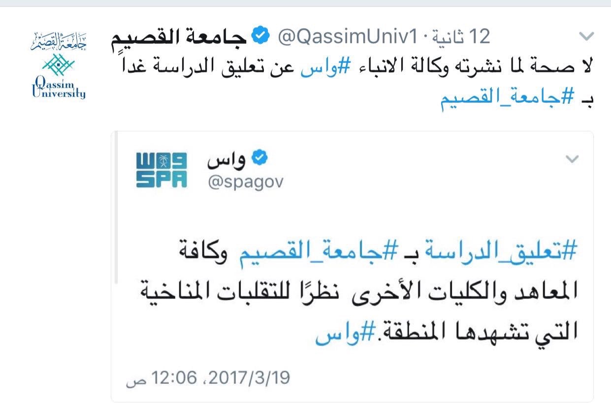 وبعد دقائق من إعلان وكالة الأنباء السعودية عن تعليق الدراسة، أعلنت جامعة القصيم عبر حسابها الرسمي بموقع التواصل الاجتماعي “تويتر” قائلة: لا صحة لما نشرته وكالة الأنباء “واس” عن تعليق الدراسة بجامعة القصيم.