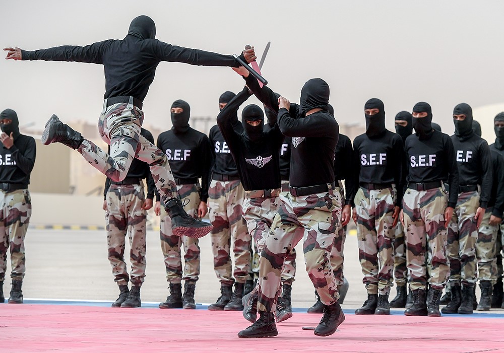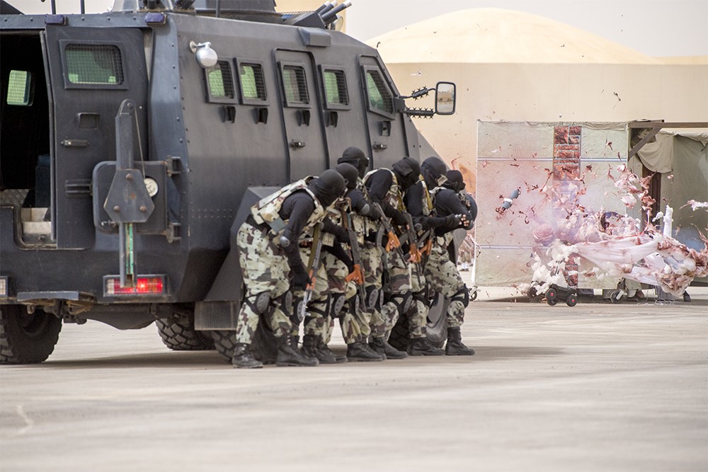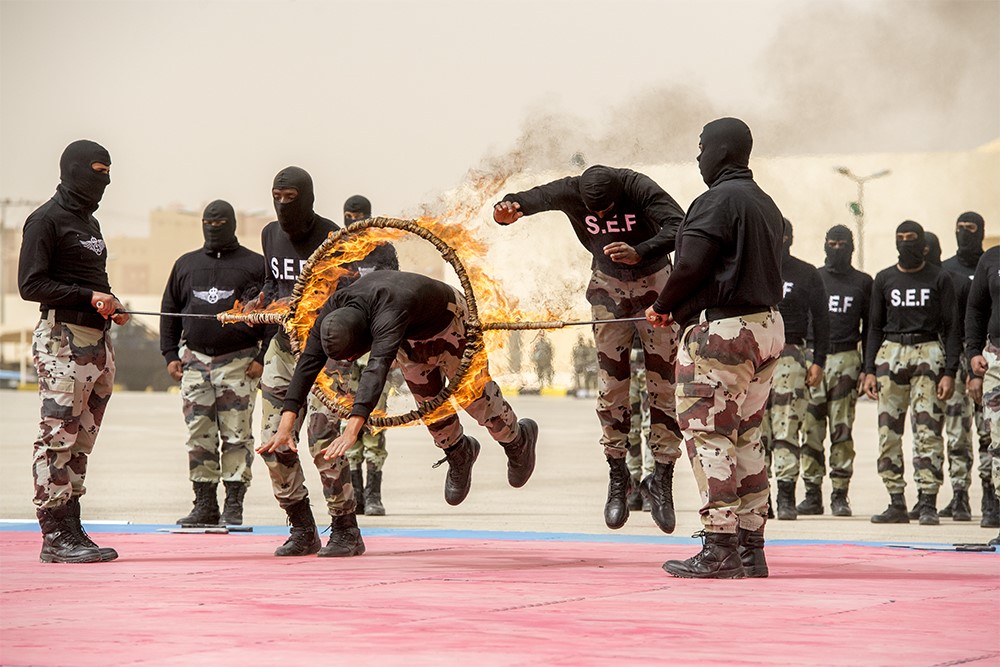 ثم شاهد سموه والحضورُ عرضَ الهرولة الخاصة، والاستعراض بالآليات، والقتال اليدوي، وفرضية المطاردة والاقتحام وتطهير المواقع والدفاع عن النفس، وكيفية التعامل مع المجموعات الإرهابية والمسلحة، وفرضية الرماية بالأسلحة التخصصية الخاصة، والعرض العسكري، ومهارات نزول الحبال من البرج بأنواعها المختلفة، وشاهد عرض الفصيل الصامت الذين شكلوا لوحة عن الرؤية 2030، إضافة إلى مهارات التكيف مع الظروف الطبيعية الصعبة التي تواجه رجال الطوارئ الخاصة أثناء أداء مهامهم القتالية والعسكرية.