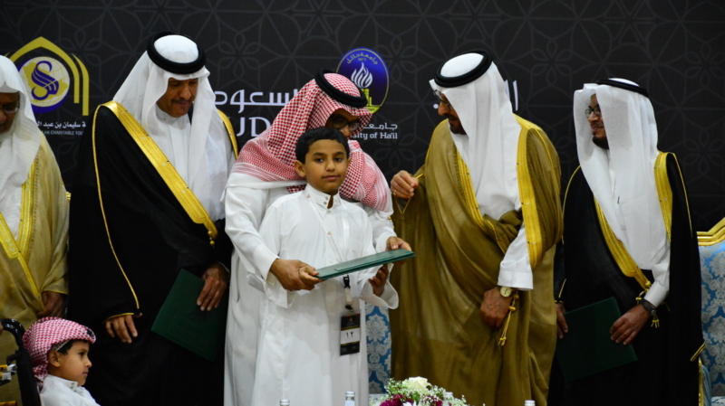 كرمّ أمير منطقة حائل صاحب السمو الملكي الأمير سعود بن عبد المحسن بن عبد العزيز، مساء الثلاثاء، الأطفال ذوي الإعاقة الفائزين في الدورة الحادية والعشرين من جائزة الأمير سلطان بن سلمان بن عبد العزيز لحفظ القرآن الكريم، في مقر مركز الملك سلمان لرعاية الأطفال المعوقين بحائل.