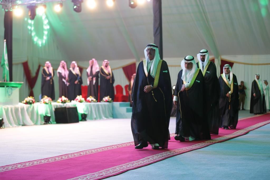 وحضر الحفل عدد من أعيان المنطقة ومدراء الإدارات الحكومية وأولياء أمور الطلبة الخريجين، ثم عزف السلام الملكي, وبعدها بدأت مسيرة الخريجين، يتقدمهم معالي مدير الجامعة والوكلاء وعمداء الكليات، ثم بدأ الحفل الخطابي بتلاوة آيات من القرآن الكريم.