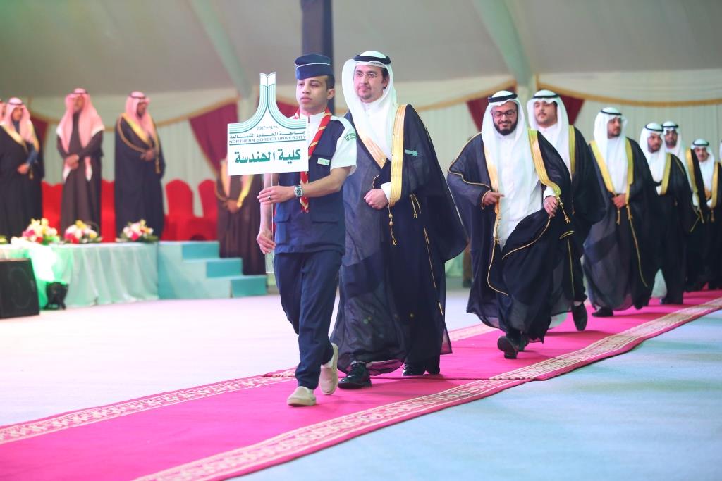 وعقب ذلك ألقى أحد الخريجين كلمة الطلبة الخريجين، أعرب فيها عن شكره لسمو أمير منطقة الحدود الشمالية على رعاية حفل التخرج، ولمعالي مدير الجامعة، ثم أدى خريجو كليتي الطب والصيدلة القسم الذي تلاه عميد كلية الطب، ثم أعلن عميد القبول والتسجيل الدكتور فراس بن محمد المدني أعداد الخريجين وأسماء الأوائل والمتفوقين، ثم عرض مرئي عن مسيرة الجامعة خلال عشر سنوات.