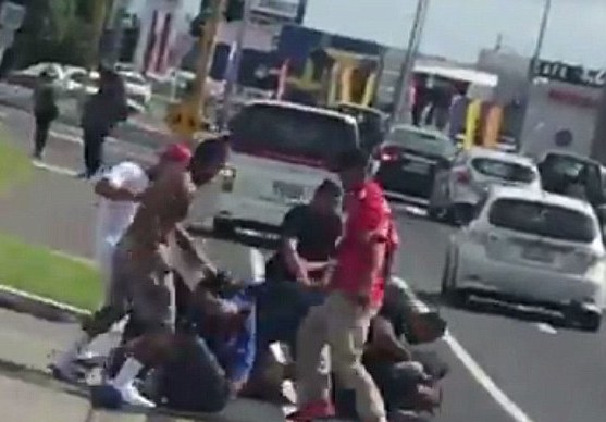 ونشرت صحيفة “ديلي ميل” البريطانية، المقطع الذي يرصد مضاربة عنيفة بين مجموعة من الشباب بأحد شوارع أوكلاند، وأمسك اثنان ببعضهما البعض أرضاً، بينما شارك آخرون بالضرب والركل ووصل عددهم إلى سبعة أشخاص.