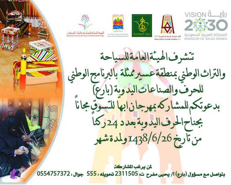 فتحت الهيئة العامة للسياحة والتراث الوطني بمنطقة عسير، ممثلة في البرنامج الوطني للحرف والصناعات اليدوية “بارع”، الفرصة للحرفيين والحرفيات والموهوبين والموهوبات للمشاركة المجانية في جناح الحرف اليدوية بمهرجان أبها للتسوق، الذي يفتح أبوابه للزوار بمركز المعارض الدولي بجوار المطار، اعتباراً من السبت 26 جمادى الآخرة الجاري، ويستمر لمدة 30 يومًا، في معرض استثنائي بمناسبة اختيار أبها عاصمة للسياحة العربية 2017 م.