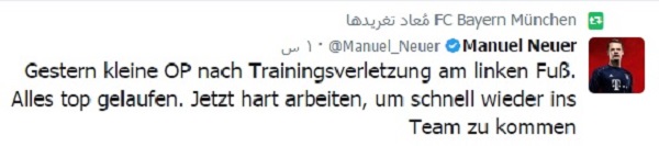 أعلن نادي بايرن ميونخ، متصدر الدوري الألماني لكرة القدم (بوندسليغا)، اليوم الخميس، أن مانويل نوير حارس المرمى خضع لعملية جراحية في قدمه اليسرى وسيغيب عن الفريق في مباراتيه المقبلتين، ولم يدخل بايرن في أي تفاصيل، ذاكراً فقط إن الإصابة حدثت في التدريب، وأنه سيغيب عن مباراتي فريقه أمام أوغسبورغ، بعد غد السبت، وأمام هوفنهايم، الثلاثاء المقبل،