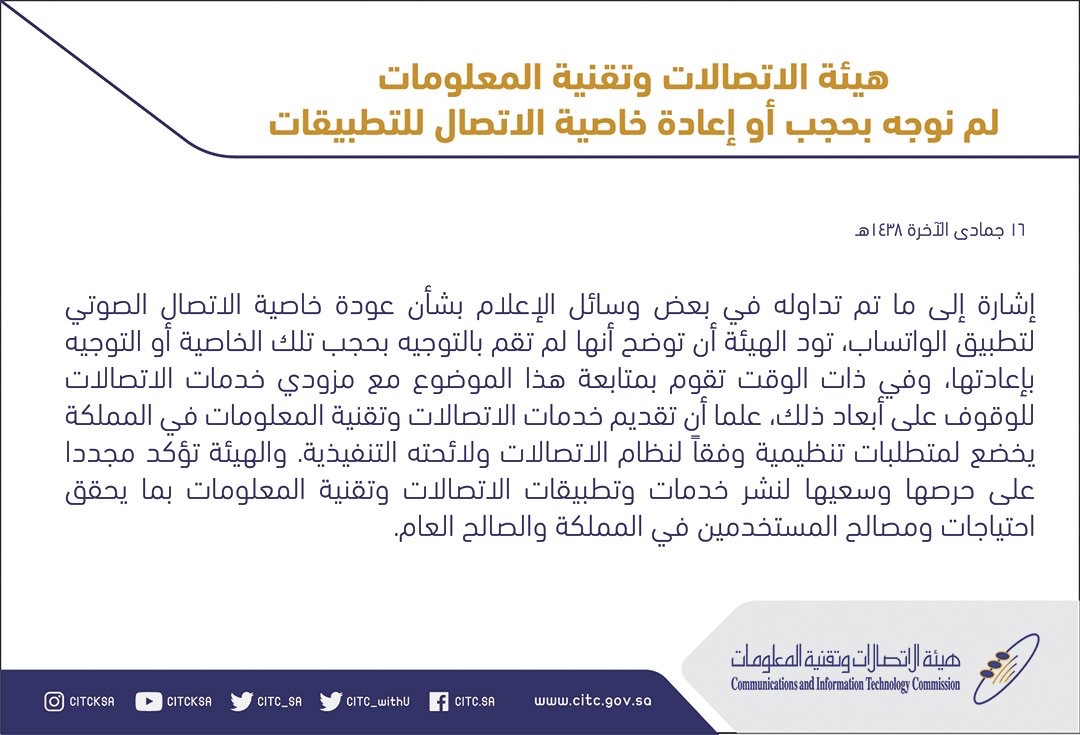 نفت هيئة الاتصالات وتقنية المعلومات،‬⁩ توجيهها بحجب أو إعادة خاصية ⁧‫اتصال‬⁩ التطبيقات،‬⁩ ومن ذلك مكالمات تطبيق “واتس آب”.
