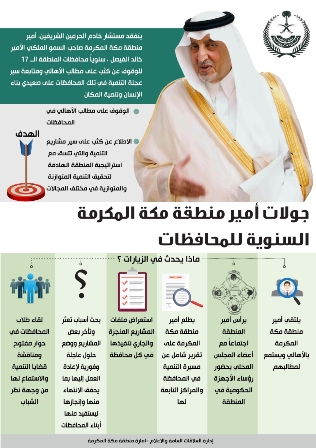 يستأنف مستشار خادم الحرمين الشريفين أمير منطقة مكة المكرمة الأمير خالد الفيصل غدًا الأحد، جولاته السنوية لمحافظات المنطقة بزيارة محافظات الشريط الساحلي والتي يبدأها بالليث ، تليها أضم والقفنذة ، وأخيراً العرضيات .