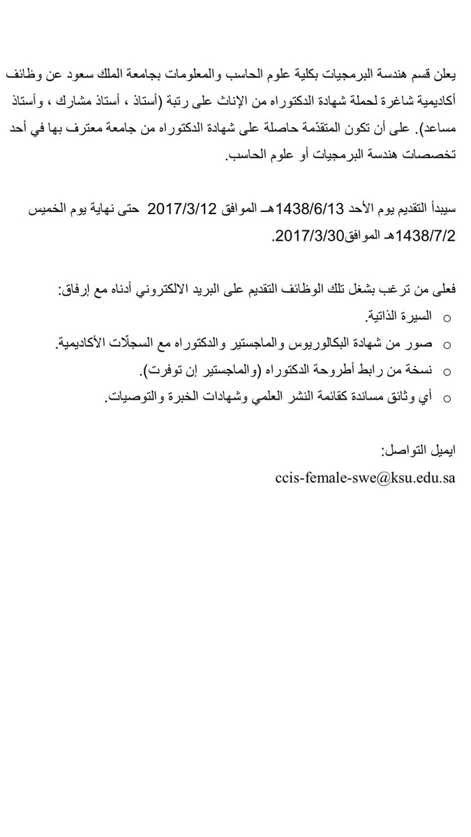 أعلن قسم هندسة البرمجيات بكلية علوم الحاسب والمعلومات في جامعة الملك سعود، عن توفر وظائف أكاديمية شاغرة، لحملة شهادة الدكتوراة من الإناث.