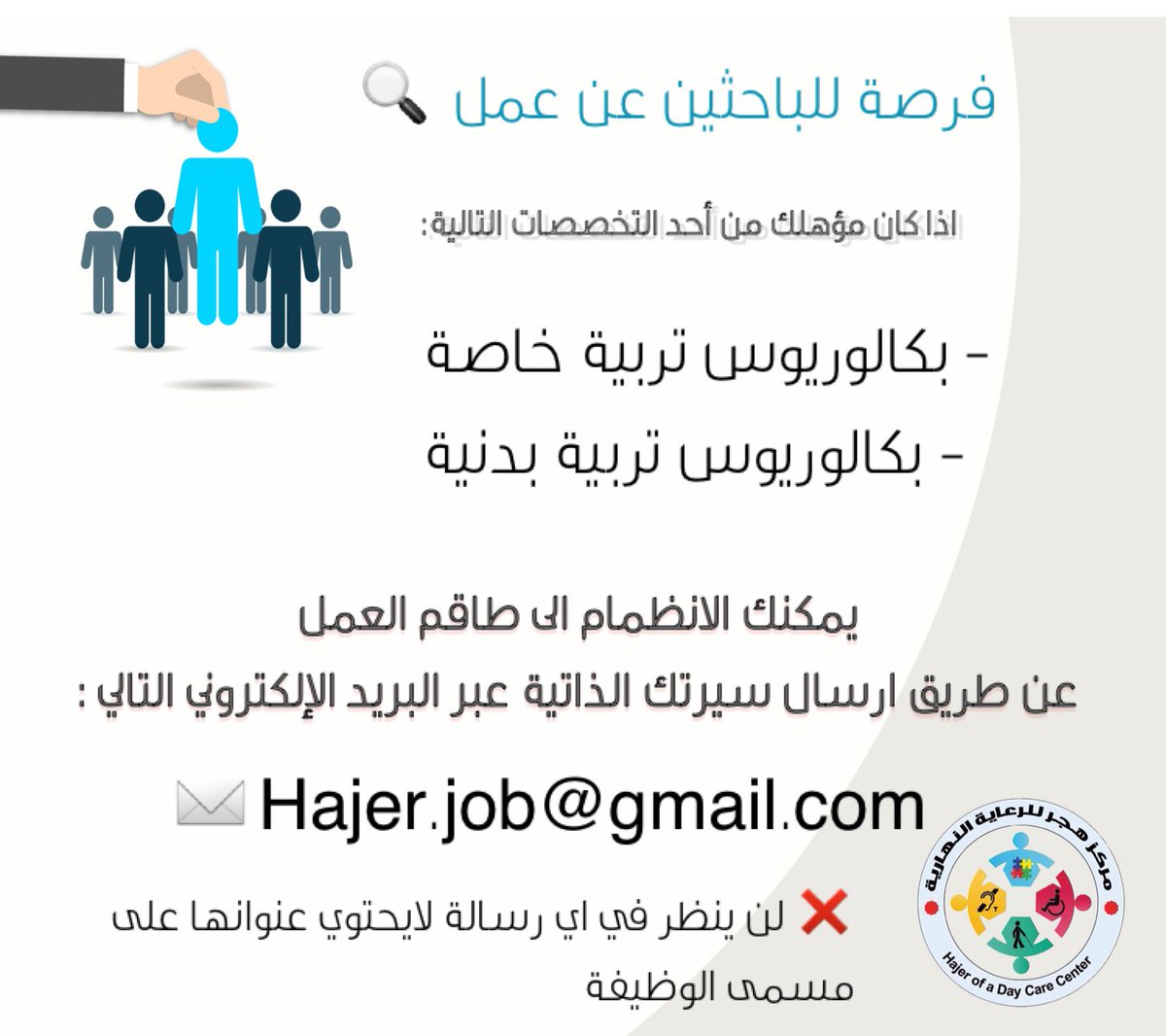 أعلن مركز هجر للرعاية النهارية والتأهيل بمحافظة الأحساء عن توفر وظائف تعليمية شاغرة، وفق التخصصات التالية: