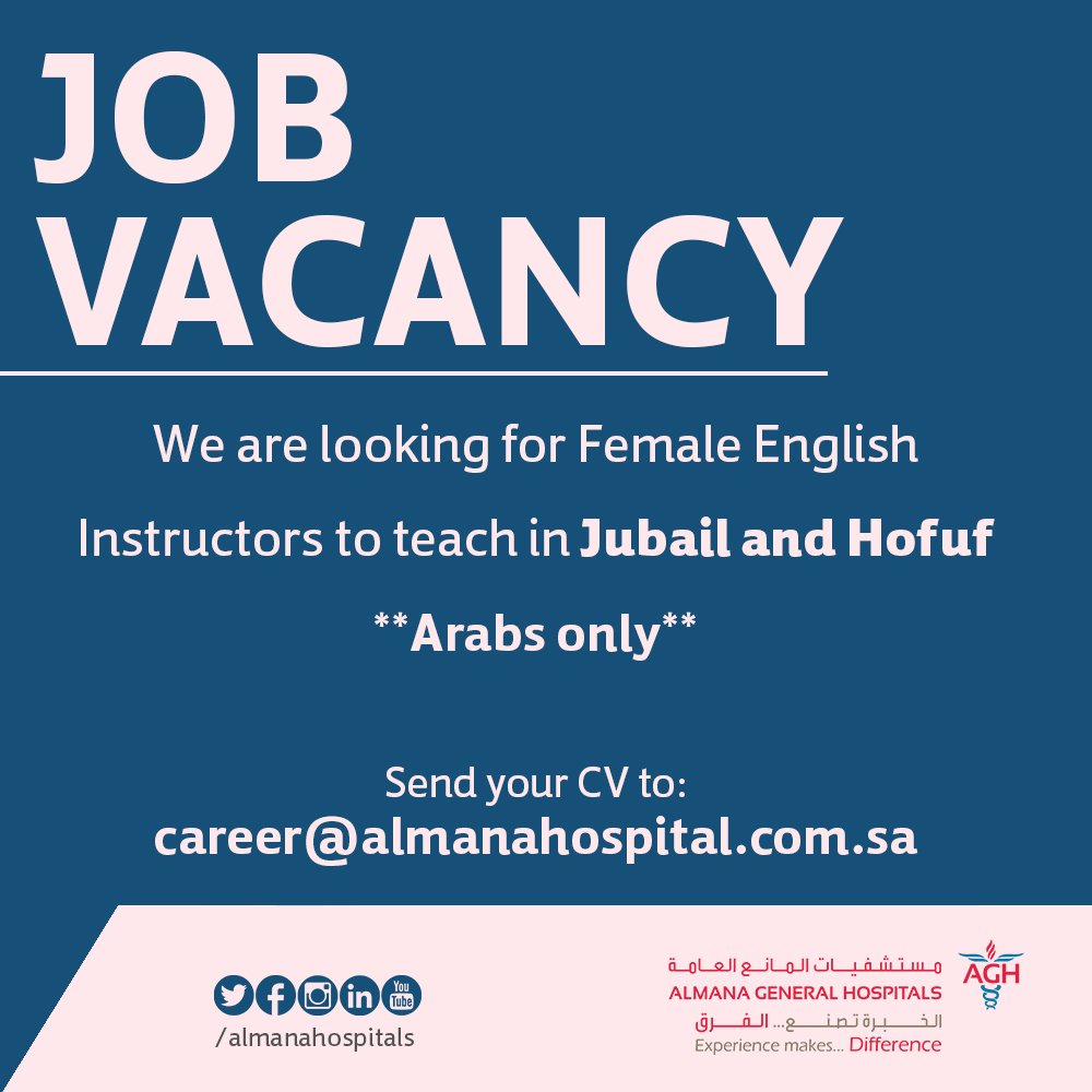 أعلنت شركة مجموعة مستشفيات المانع العامة بالمنطقة الشرقية عن توفر وظائف شاغرة للنساء، بمسمى “مدرسات لغة إنجليزية”، وذلك للعمل بفروع المستشفى في كل من الجبيل، والهفوف.