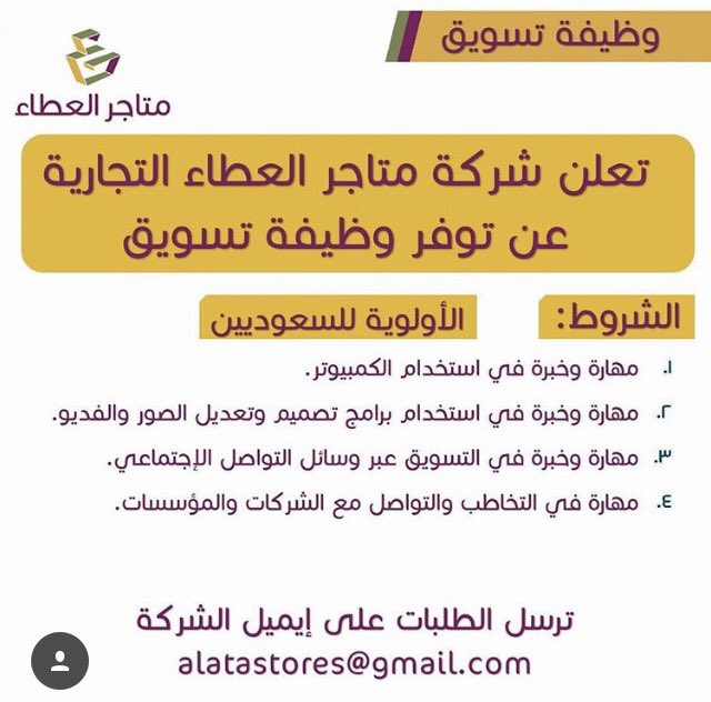 #وظائف_شاغرة بشركة متاجر العطاء في #خليص