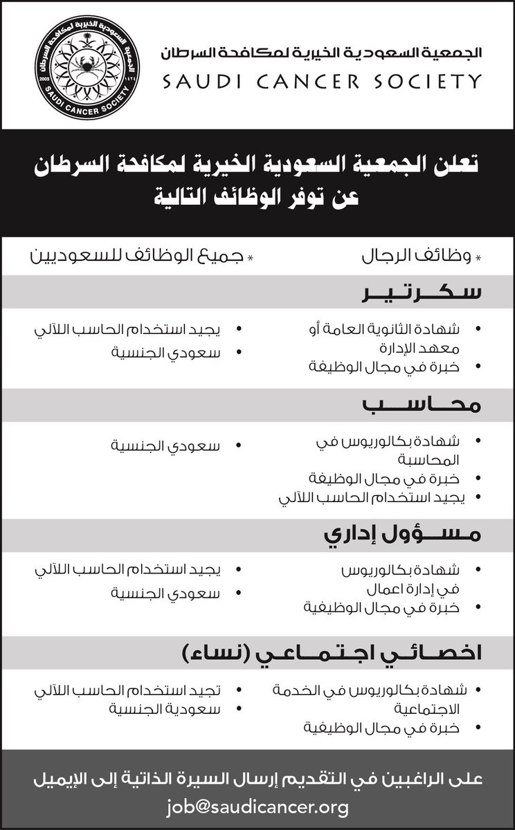 أعلنت الجمعية السعودية الخيرية لمكافحة السرطان بمدينة الرياض عن توافر وظائف شاغرة للسعوديين والسعوديات، لحملة شهادات البكالوريوس ومعهد الإدارة والثانوية العامة، وفقًا للوظائف والشروط التالية: