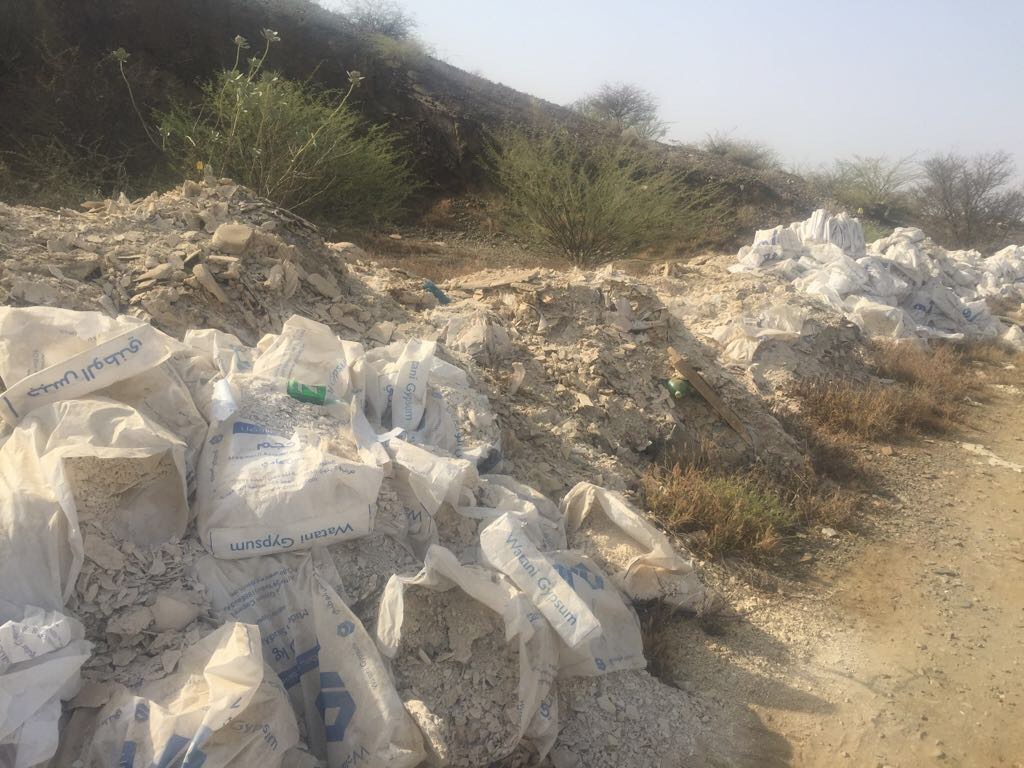 ترمي مصانع ومحلات الجبس في محافظة المجاردة، مخلفاتها على قارعة الطريق وعلى ضفاف وادٍ مجاور لها.