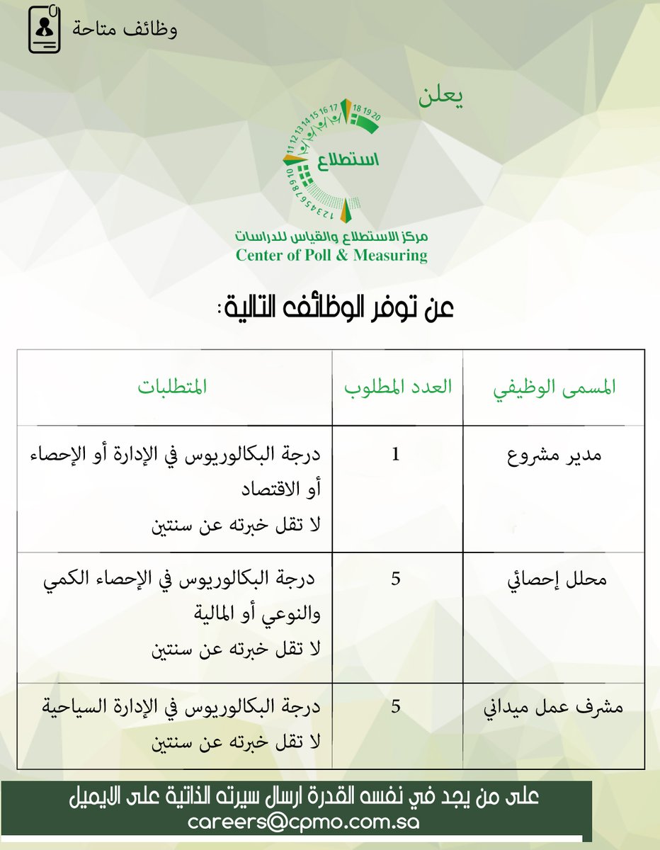 أعلن مركز الاستطلاع والقياس للدراسات والاستشارات عن توفر عدد (11) وظيفة شاغرة للرجال، وذلك وفق الوظائف والشروط التالية:
