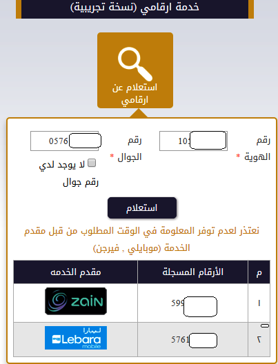 ويمكن لمشتركي شركات الاتصالات المحلية، البحث عن أي رقم تحت هويتهم، دون عناء يذكر، عبر إدخال رقم الهوية ومن ثم رقم جوال يحمله، ليتم على ذلك بعث رمز تحقق مؤقت، يصل فقط لباغي البحث، وبعد إدخال الرمز يستعرض الموقع الأرقام المسجلة لدى الشركاتكافة تحت رقم الهوية المدخل.