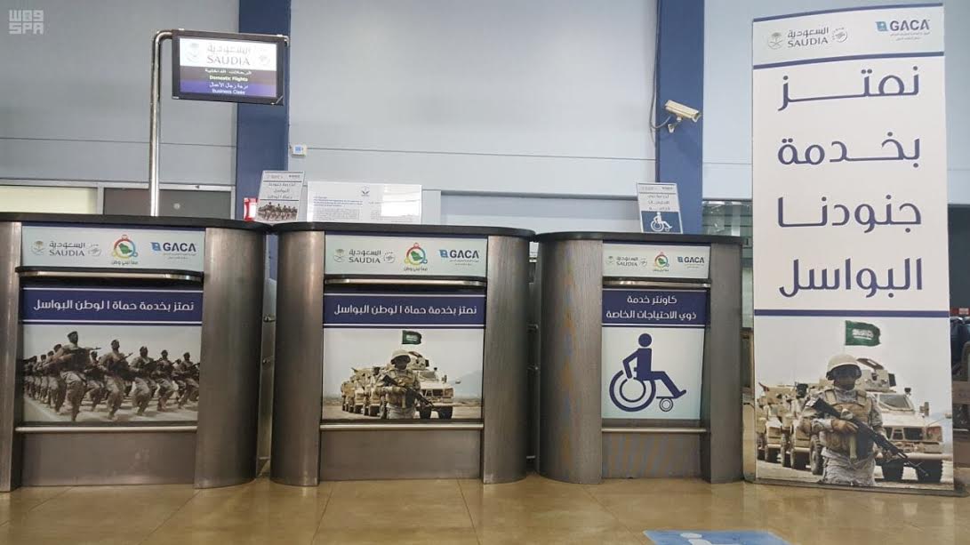 وأوضح مساعد المدير العام للاتصال المؤسسي المتحدث الرسمي للخطوط السعودية المهندس عبدالرحمن الطيب، أنّه تم مساء الاثنين، تخصيص منصة الخدمة رقم (C4) في مطار الملك خالد لهذا الغرض، حيث تم تقديم التسهيلات والخدمات كافة لإنهاء إجراءات السفر، إضافة إلى باقة الخدمات التي توفرها “السعودية” دعماً لجنودنا البواسل المرابطين على الحدود وأسرهم.