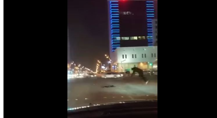 ويوضح الفيديو الذي وثقه أحد قائدي المركبات، دهشة المارة من حركات الشاب، والهدف من وراء القيام بهذا العمل.