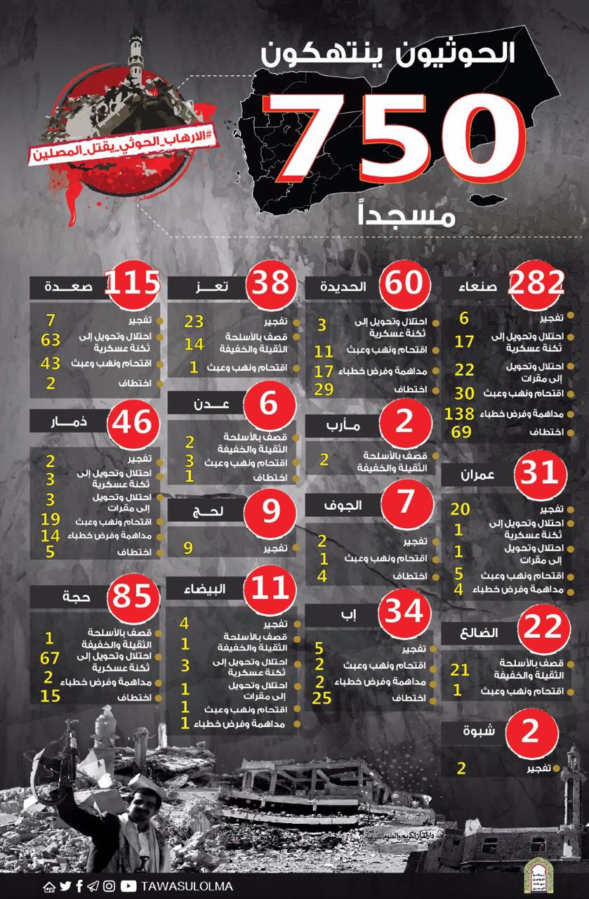وشملت انتهاكات الحوثيين أكثر من 750 مسجدًا في اليمن، توزعت تلك الانتهاكات الجسيمة بين التفجير الكُليِّ، والقصف بالسلاح الثقيل، والنهب لمحتوياته كافة من أثاث وتجهيزات، علاوة على استخدام بعض المساجد مجالس للقات وثكنات لمسلحي ميليشيا الحوثي والمخلوع صالح.