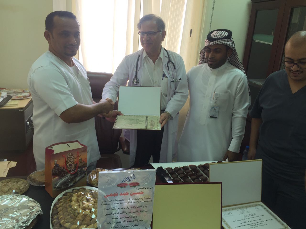 وقدّم التكريم مدير المركز الدكتور سيد شبير حسن عابدي، ومساعده الإداري علي عطية نجمي، وكل منسوبي المركز بقسميه الرجال والنساء، راجين من الله أن يكتب له دوام الصحة وحياة عملية موفقة.