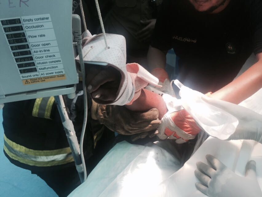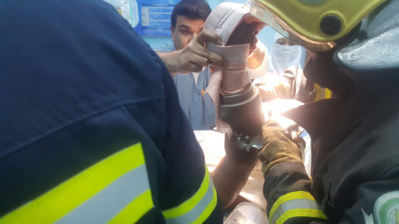 وأضاف أنه تم إخراج يد العامل مع الجزء الذي علقت به يده، ونقله للمستشفى حفاظًا على سلامته لقص الجزء المتبقي تحت إشراف كادر طبي، وفي المستشفى تم قص الجزء المتبقي وتحرير يد العامل من قبل الفرقة، مبينًا أن العامل بصحة جيدة ولله الحمد.